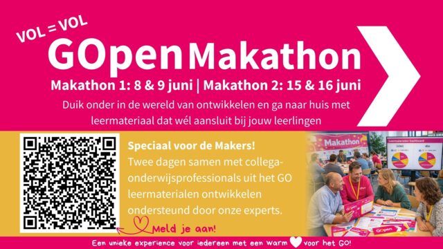 Goed leermateriaal maak je samen! Daarom organiseren bij de GOpen Makathon! Duik samen met andere onderwijsprofessionals uit het GO twee dagen onder in de wereld van materiaal ontwikkelen. Je wordt begeleid door onze onderwijskundig expert en (eind) redacteur zodat jij kunt focussen op waar jij goed in bent: leermateriaal maken dat aansluit bij jouw leerlingen.
